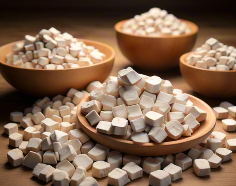 去皮后切制的茯苓,一般會(huì)呈現(xiàn)白色、淡紅色或淡棕色。正品茯苓表面色澤均勻、斷面細(xì)膩,而劣品茯苓外表色澤不均勻、切面粗糙。