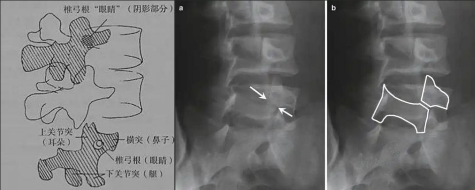 圖a和圖b 腰椎斜位:狗脖“戴項(xiàng)圈征”,診斷椎體椎弓峽部裂