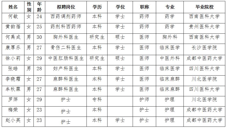 根據(jù)《瀘州市中醫(yī)醫(yī)院編外人員管理辦法》規(guī)定,經(jīng)過筆試、面試、體檢考察環(huán)節(jié),擬錄用何敏等十六人為我院編外職工,現(xiàn)將該十六名同志基本情況進行公示,公示期5個工作日,廣大群眾如有認為此十六名同志有不適合錄用的問題,可以來電、來信或現(xiàn)場方式于2018年3月29日前,以真實姓名,實事求是地反映問題,并提供必要...