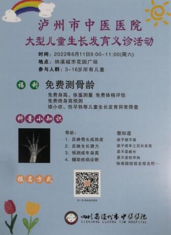 6月11日,來納溪城市花園廣場吧!瀘州市中醫(yī)醫(yī)院城南院區(qū)將在此開展大型兒童生長發(fā)育義診活動(dòng),通過專業(yè)骨齡檢測儀器,方便快捷,輻射基本忽略不計(jì)。免費(fèi)為3—16歲兒童免費(fèi)測骨齡,進(jìn)行矮小癥、性早熟等兒童生長發(fā)育異常篩查。