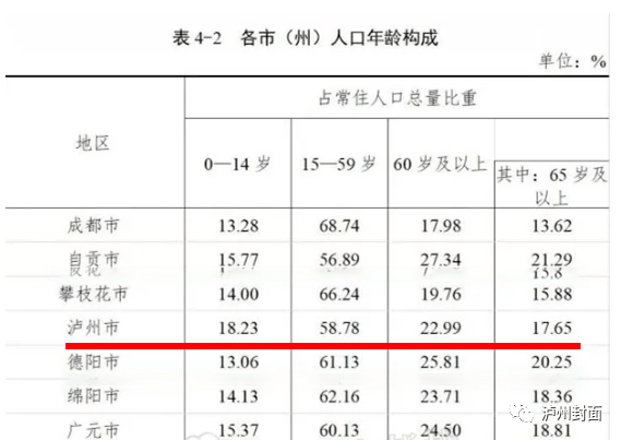 第七次全國(guó)人口普查數(shù)據(jù)顯示,瀘州市60歲及以上人口約97.8萬(wàn)人,占比達(dá)22.99%,其中65歲及以上人口占比高達(dá)17.65%,老齡化程度在四川范圍內(nèi)高居“第四”。