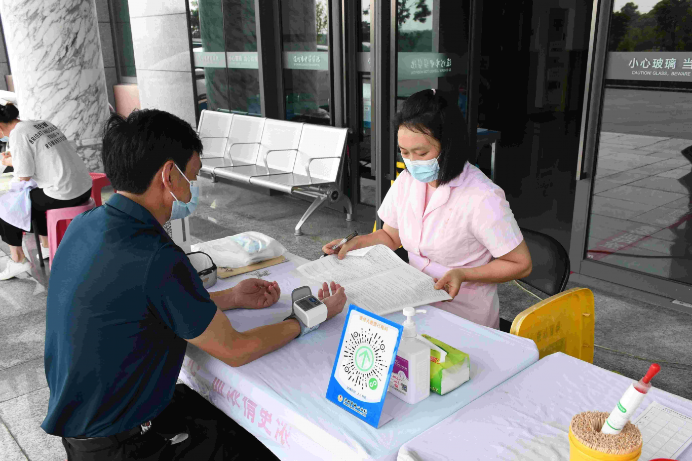 雖夏日炎炎,獻(xiàn)血人員仍陸陸續(xù)續(xù)地來到無償獻(xiàn)血活動(dòng)處排隊(duì),有趁著上班空閑時(shí)間匆忙趕來的、有剛上完班等著獻(xiàn)完血再回家休息的、也有下夜班回家后又匆匆趕來的。大家有序填寫表格信息、測量血壓、完成血液初篩,等待獻(xiàn)血。我院輸血科工作人員一邊協(xié)助血站人員開展獻(xiàn)血工作,一邊積極地向來院就診的患者及家屬宣傳獻(xiàn)血工作,作為臨床工作者,我們想讓更多的人參與到無償獻(xiàn)血活動(dòng)中,想讓更多的患者有血可用,有血可救。