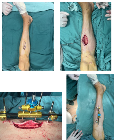 今年7月,由骨傷一科主任汪永泉帶領(lǐng)手術(shù)團(tuán)隊,為患者實施了左側(cè)脛骨橫向骨搬移術(shù)。術(shù)中,在其左側(cè)小腿脛骨內(nèi)側(cè)進(jìn)行截骨,置入4個針道,安裝外固定架,手術(shù)歷時1小時左右順利完成。經(jīng)過耐心指導(dǎo)外架調(diào)整,患者帶著外固定架回家去休養(yǎng)。