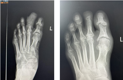 今年5月,趙阿姨在地里栽紅苕時,左腳第二足趾被鞋子磨破,起了個水泡,并逐漸發(fā)生腫脹、潰爛,在當(dāng)?shù)刂委熞粋€多月不見起色,后隨著感染加重,第二腳趾已腫脹如大腳趾一般大小,甚至長度更甚,腳趾皮膚、肌肉、骨骼均出現(xiàn)了發(fā)黑、化膿、糜爛,導(dǎo)致下肢站立疼痛,行走時步態(tài)跛行。